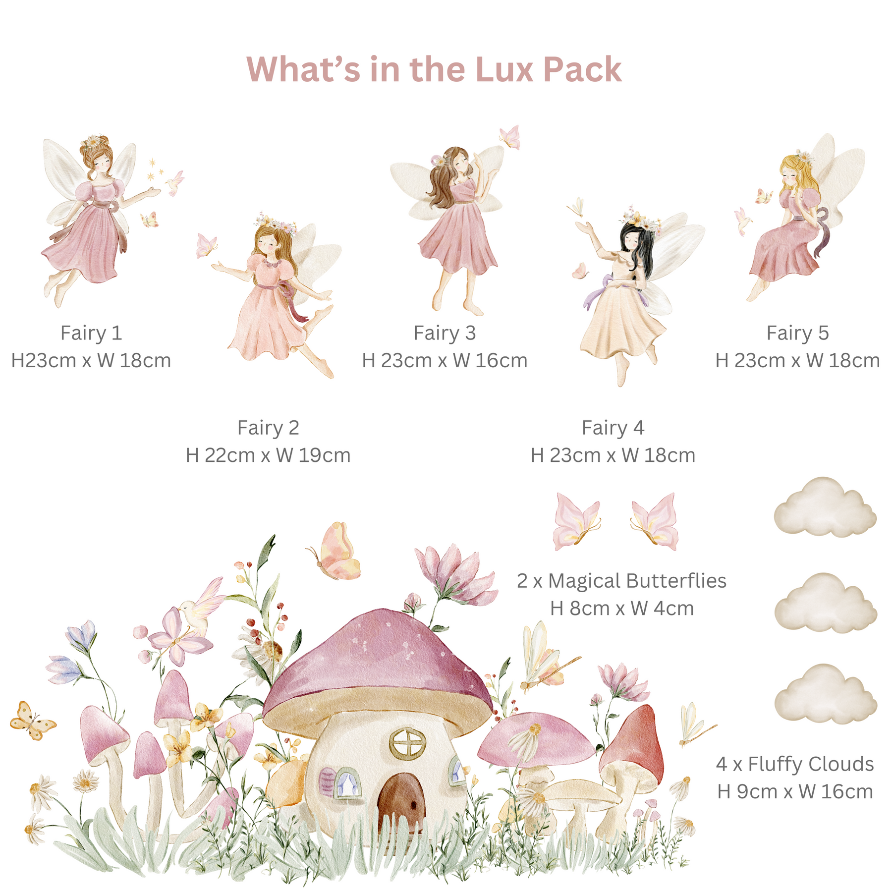 Bring magic to your little ones space with our stunning watercolour fairies. Our fairy lux pack contains a magical wonderland of 5 x fairies, an enchanting toadstool magical garden, fluffy clouds and beautiful delicate butterflies. Our decals are easy made from a premium woven fabric with low tack adhesive making them easy to apply, reposotion and remove. Our decals will not damage walls and are ideal for renters.